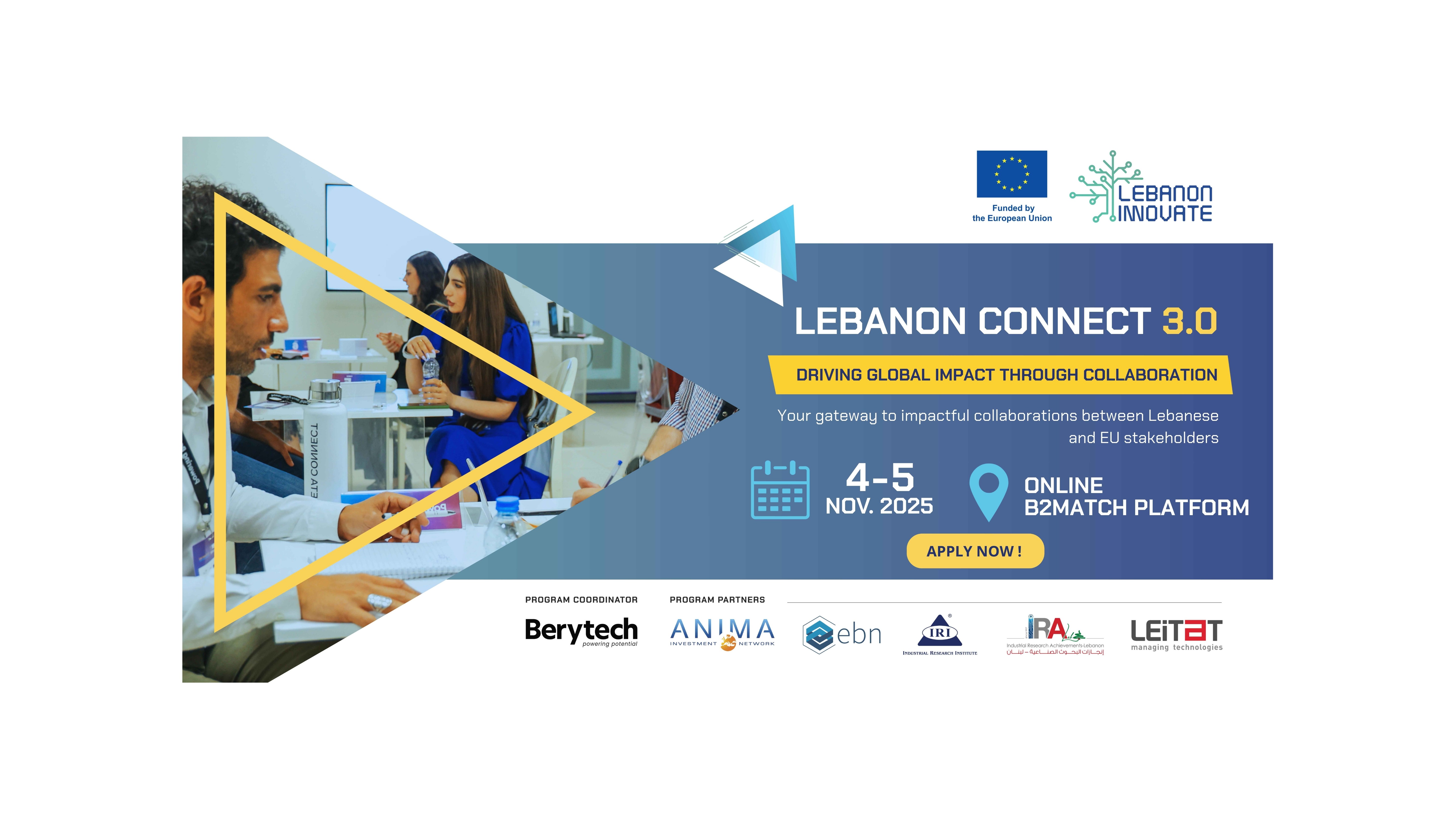 Lebanon Connect 3.0 is an exclusive matchmaking event linking Lebanese stakeholders—innovators, researchers, academia, and industry leaders—with their counterparts across the European Union. This initiative is designed to foster collaboration, technology transfer, and investment opportunities. It strengthens Lebanon’s innovation ecosystem while creating shared value with EU partners.