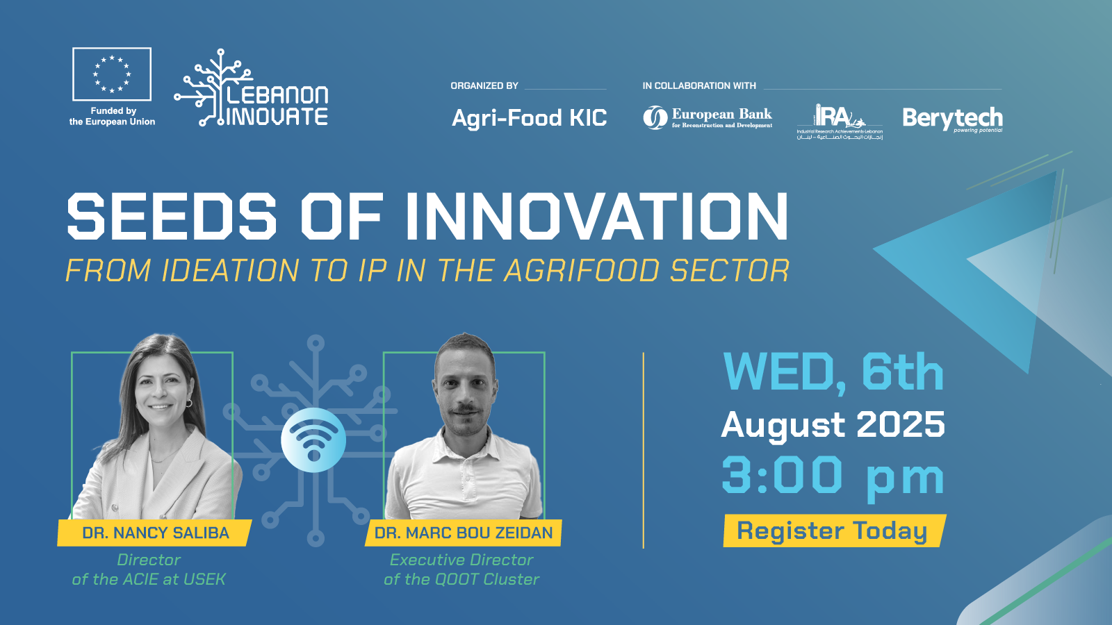 On August 6, 2025, the Seeds of Innovation webinar organized under the EU-funded Lebanon Innovate Program with EBRD, explored design thinking tools, case studies, and IP insights in the agrifood sector.