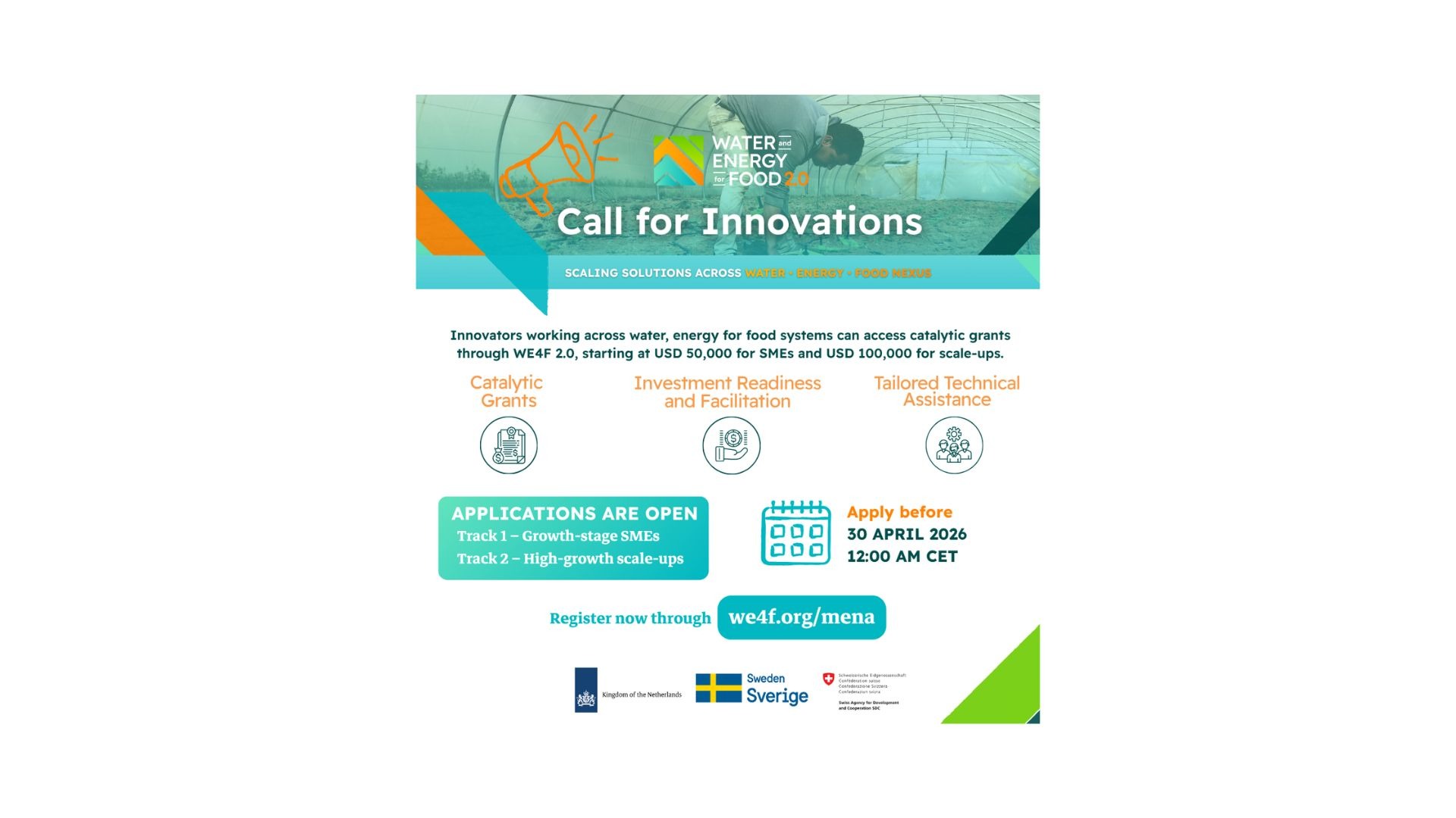 What is WE4F 2.0? WE4F 2.0 is a four-year Programme designed to increase climate resilience and security of food and water systems across the MENA region by supporting up to 120 innovative SMEs and scale-ups with tailored technical assistance, milestone-based grants, and investment facilitation. Building on WE4F 1.0, which supported 60+ companies, catalyzed $38M+ in investments, saved 11.7B liters of water and avoided 1.45M tons of CO2 emissions.